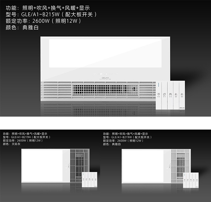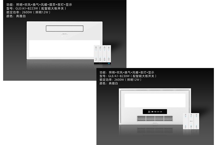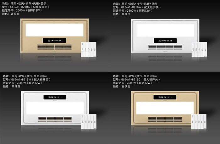 智暖系列寬屏出風設計,大功率陶瓷PTC強勁供暖,空調式體驗。加熱器防熱設計,耐高溫材質應用,多層阻燃保證,告別多余擔心。360°全方位的循環取暖,讓暖風快速均勻的布滿整個浴室,讓你沐浴不再瑟瑟發抖。讓室內空氣快速流動,從而使濁氣即刻排走,清新空氣無需等待。